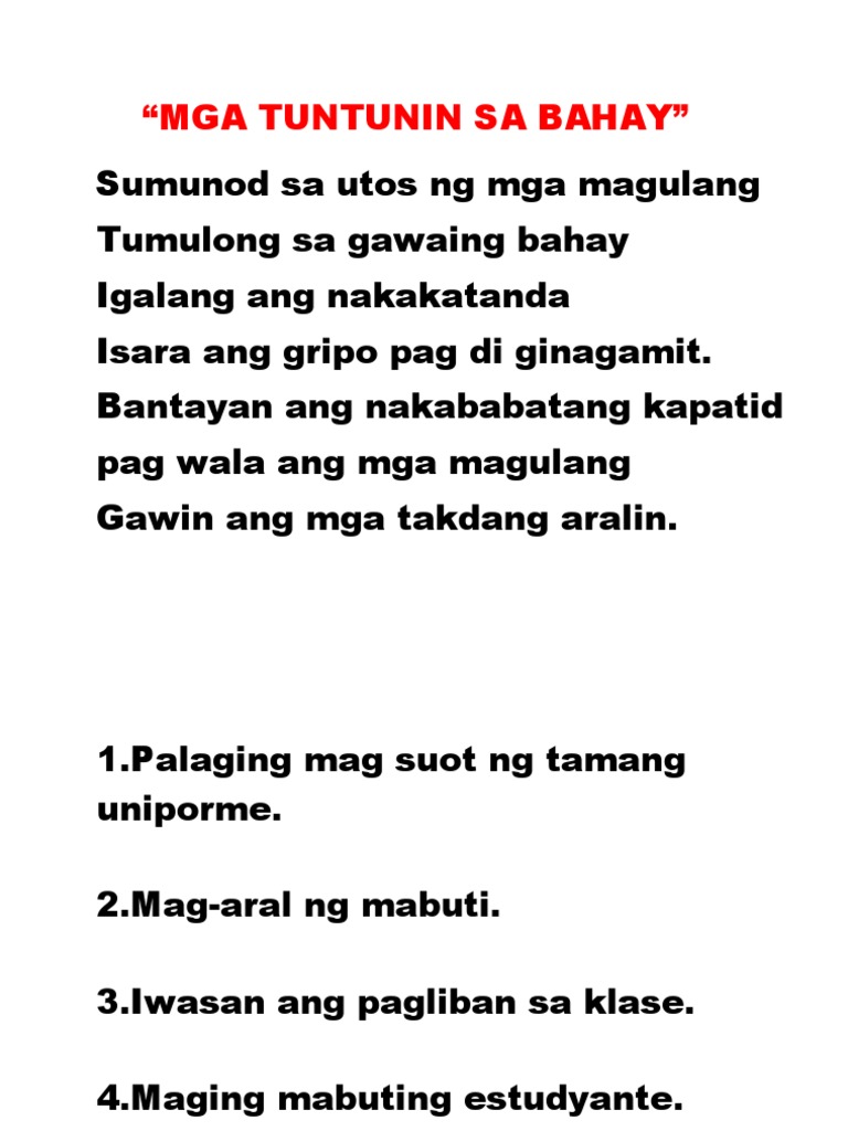 Narito ang ilang alituntunin na dapat sundin sa loob ng bahay. Ang mag-aaral ng mabuti. 1Maging magalang kanino man tuwi-tuwina.